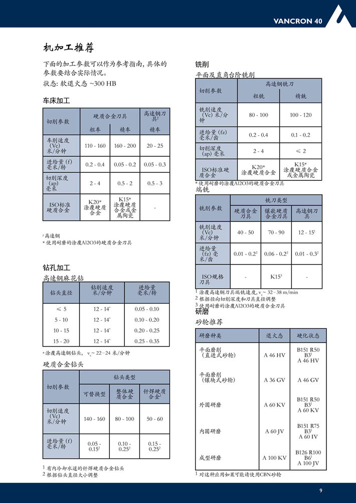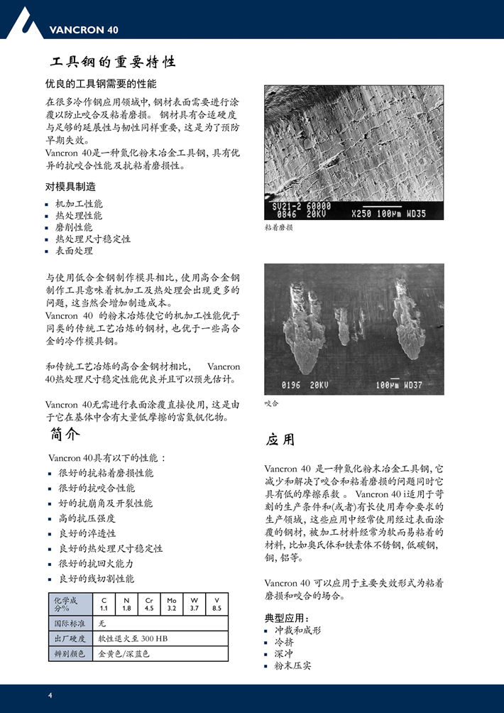 瑞典進口V40(VANCRON 40)粉末高速鋼:富氮的粉末冶金模具鋼,具有非常好的抗粘著和抗粘著磨損性能,通常不必做涂覆。...