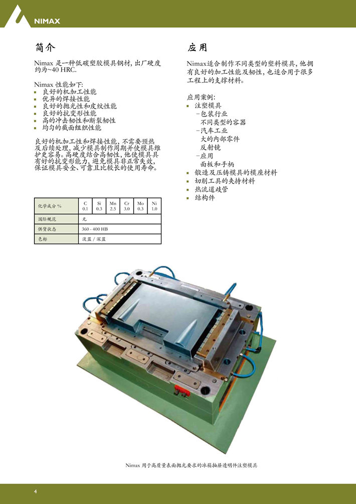 瑞典進口NIMAX塑膠模具鋼:預硬塑膠模具鋼,具有更好的韌性,機加工性和拋光性能。...